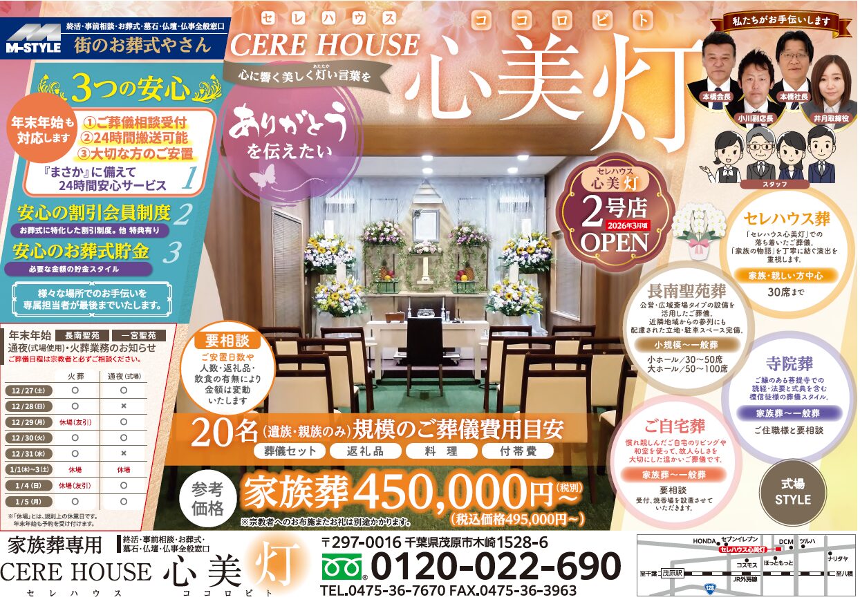 家族葬専用「セレハウス 心美灯(こころびと)」のご案内です。以下のチラシをご覧ください。 千葉県茂原市の家族葬は、M-STYLEにご相談ください。